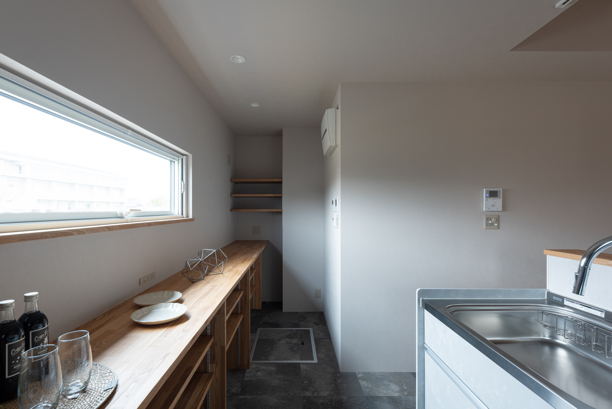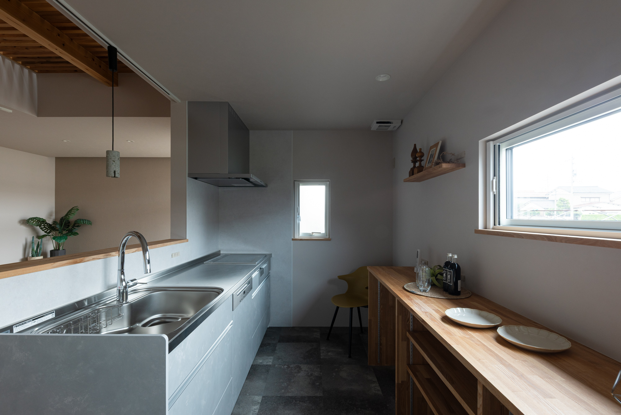 キッチンは既製品のカップボードをあえて用いず、造作のオープン棚としてあります。