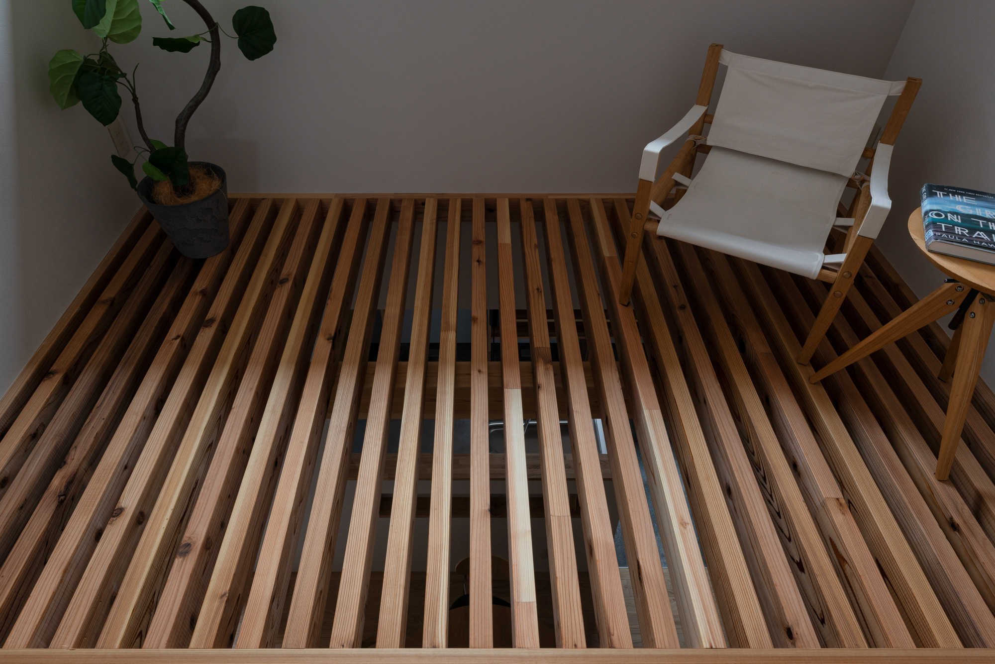 吹き抜け上部は多目的に利用できるように、人が乗っても大丈夫な強度の格子にしました。
