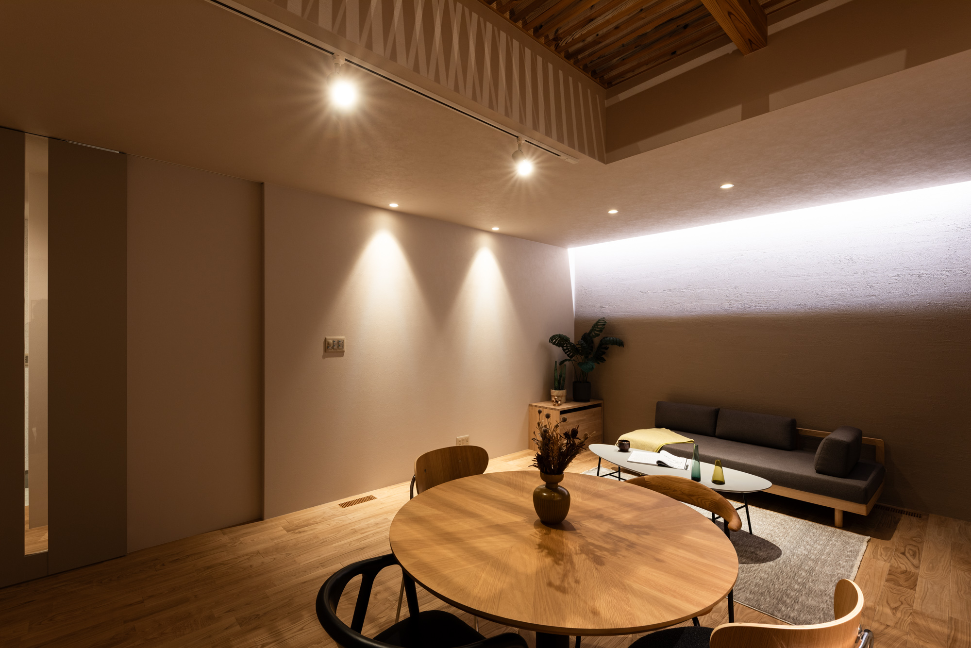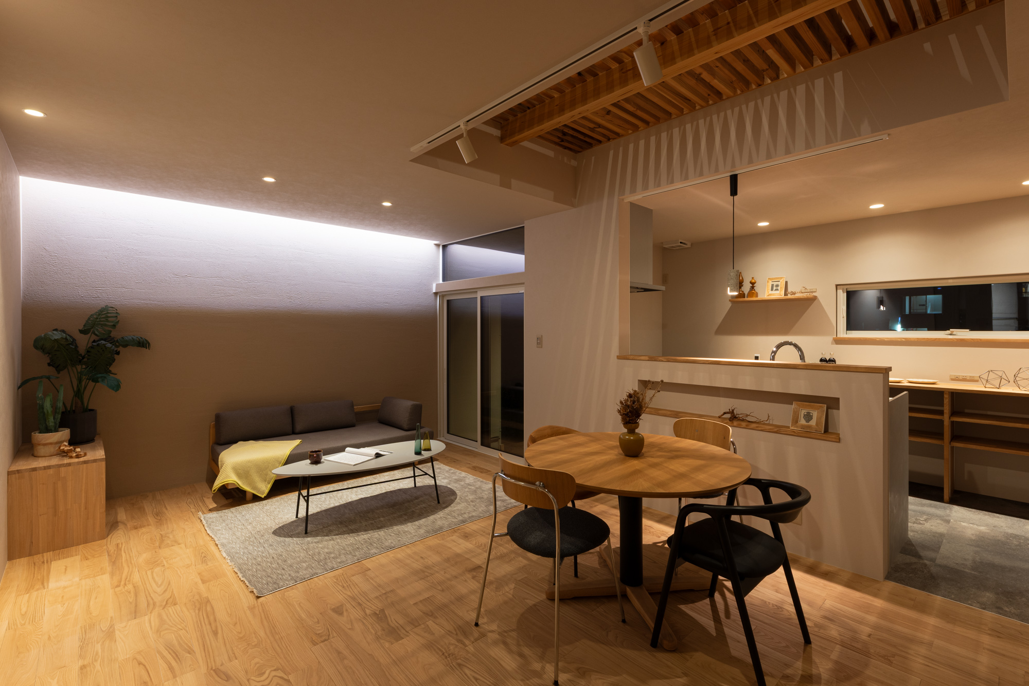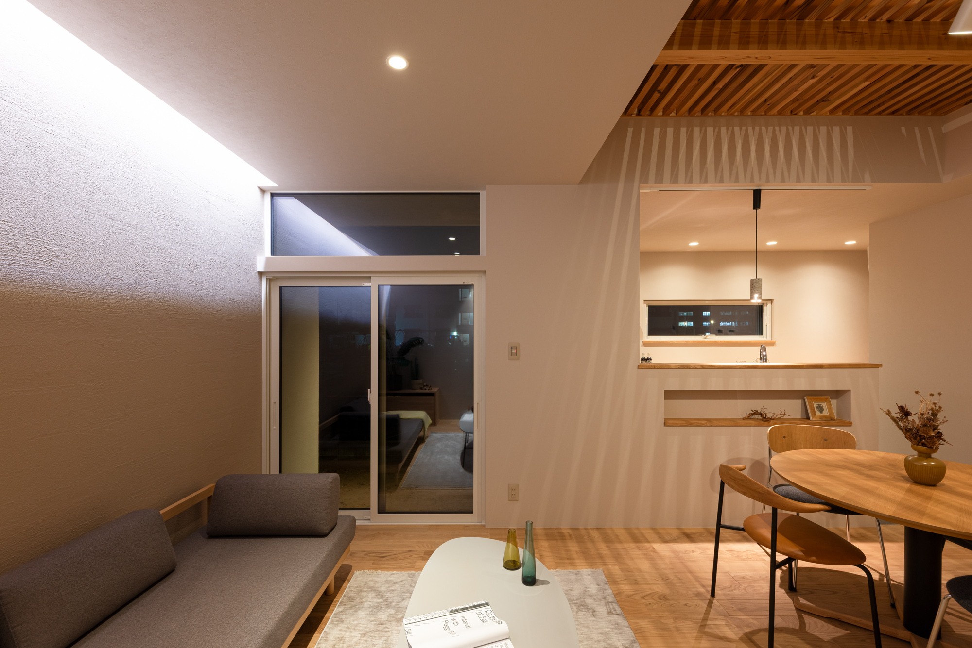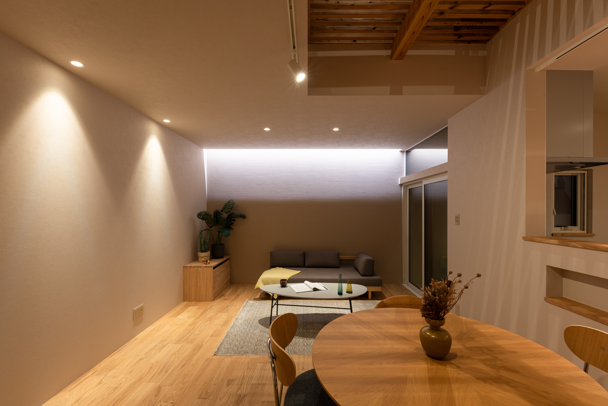 LDKの塗り壁面は間接照明を設け、窓への反射によって室内外がつながるような雰囲気にしてあり、夜でも開放感を演出しました。
