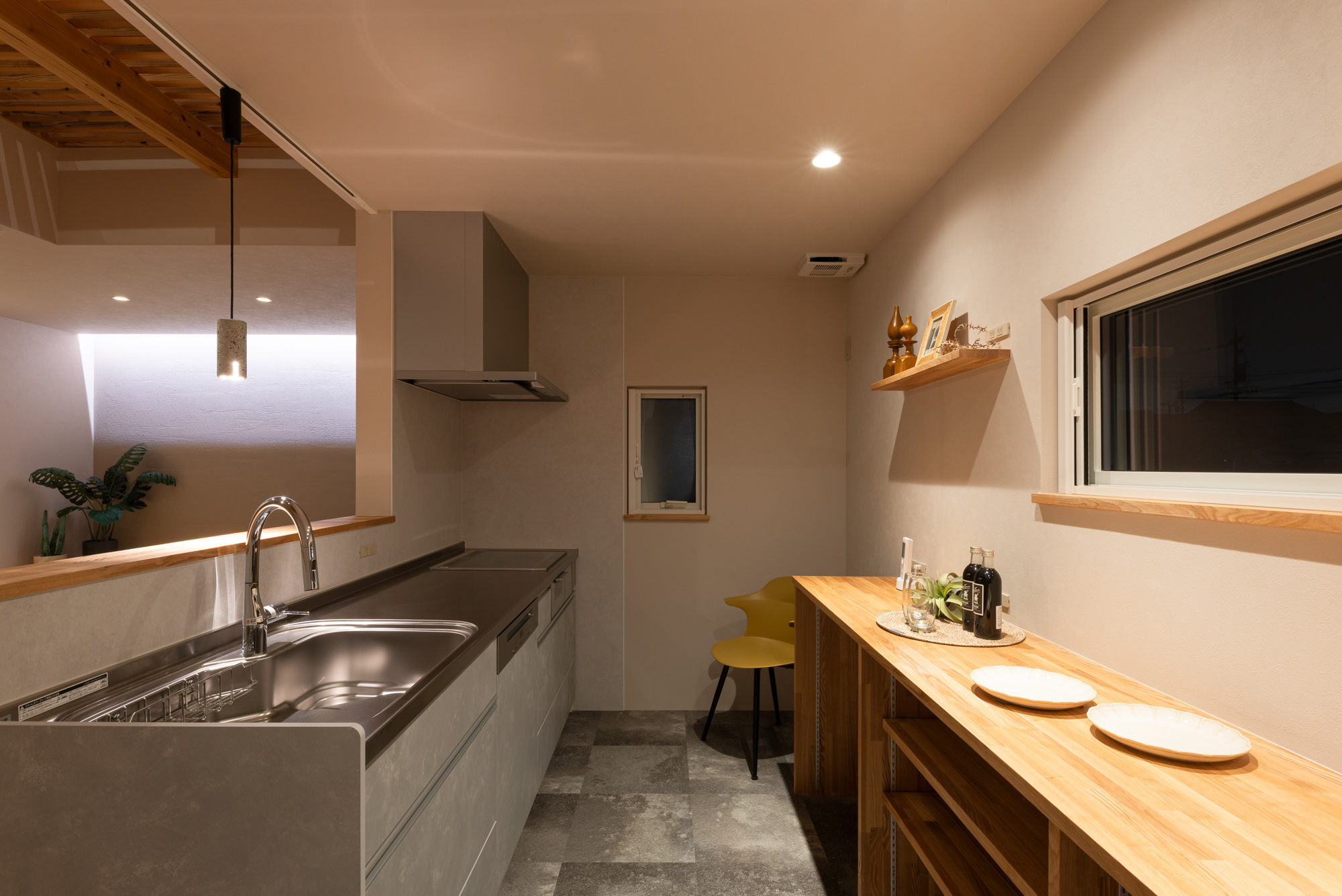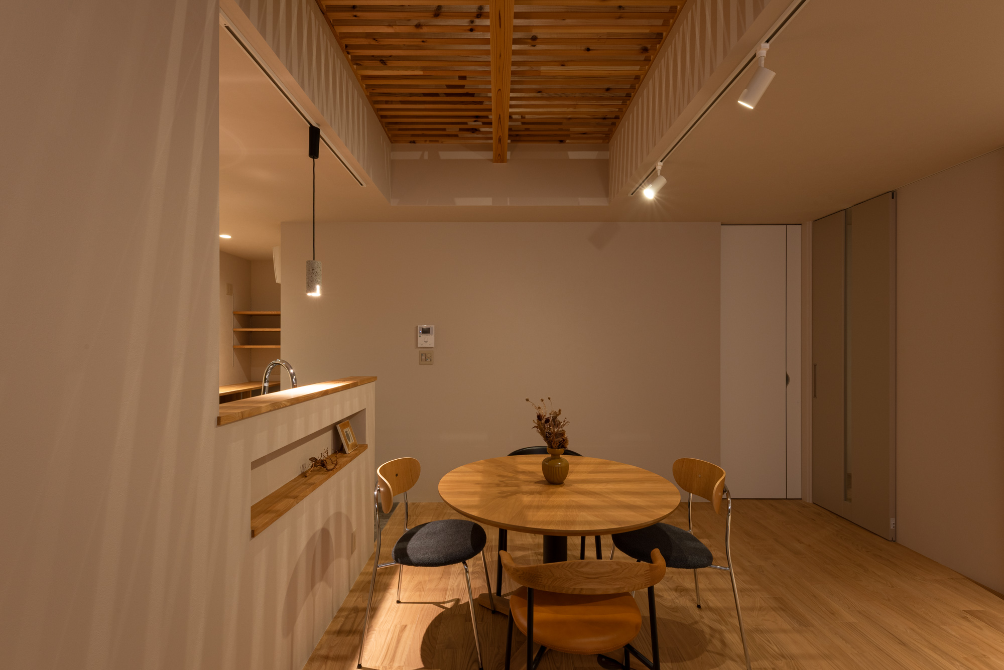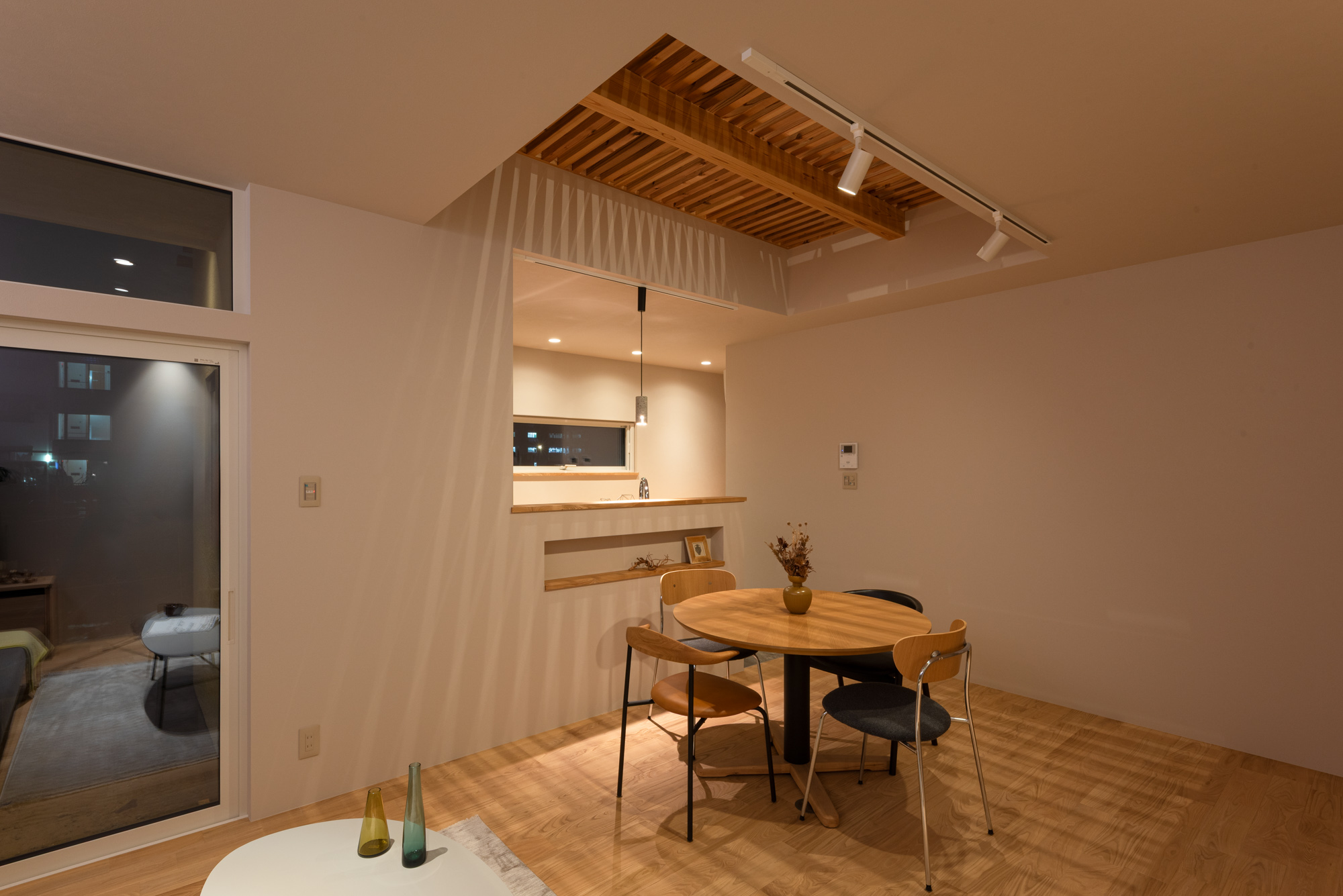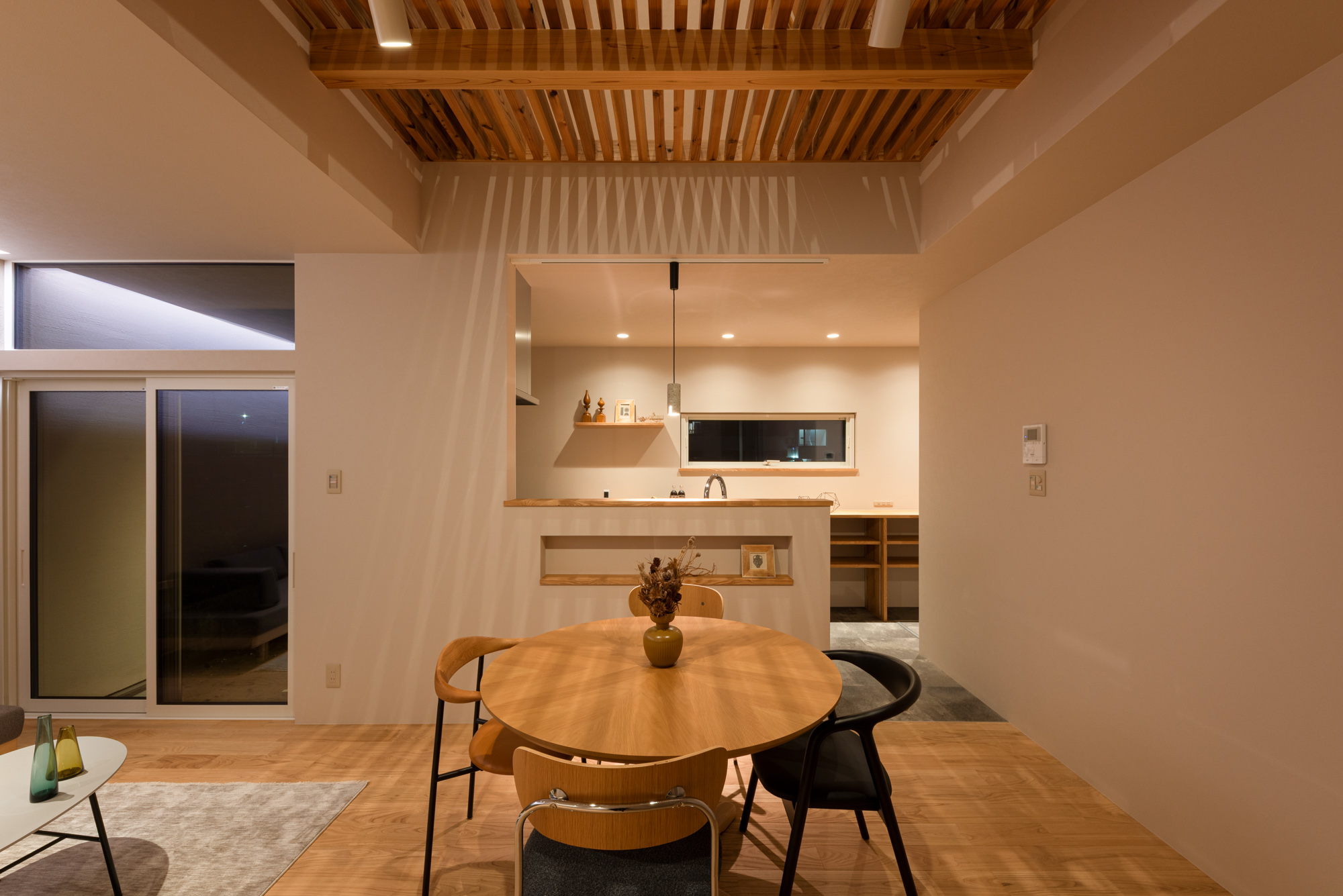 LDKの塗り壁面は間接照明を設け、窓への反射によって室内外がつながるような雰囲気にしてあり、夜でも開放感を演出しました。